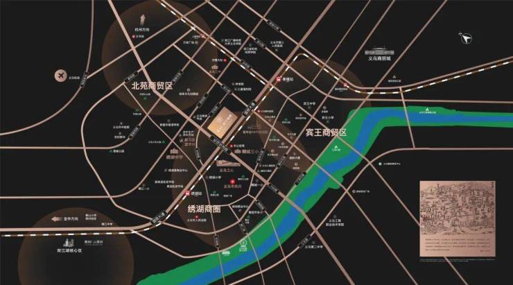 绣湖商圈、宾王商贸区、北苑商贸区3大商圈交叉辐射,距义乌繁华商业义乌之心直线距离仅约800米,尊享中芯主城的繁华。