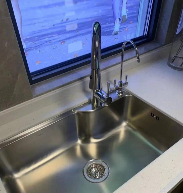 摩恩的大单槽水槽,橱柜里也是配备了厨下式净水机、洗碗机、燃气热水器(只有115是13L,其余全部是16L)。