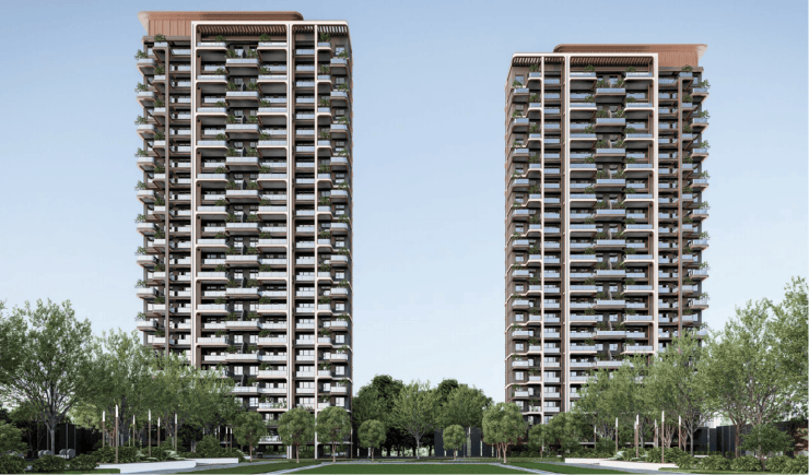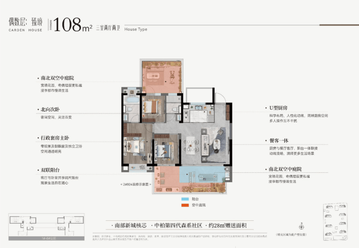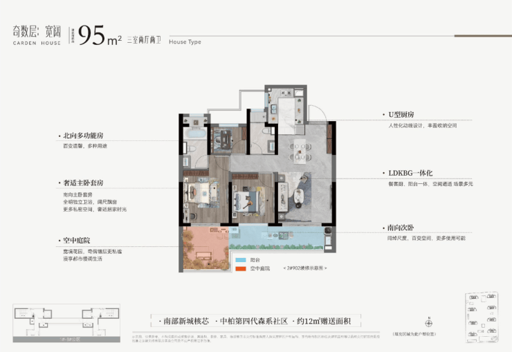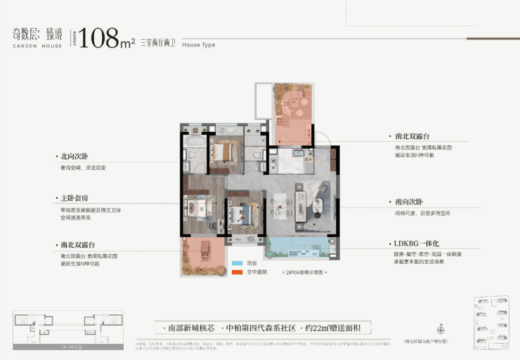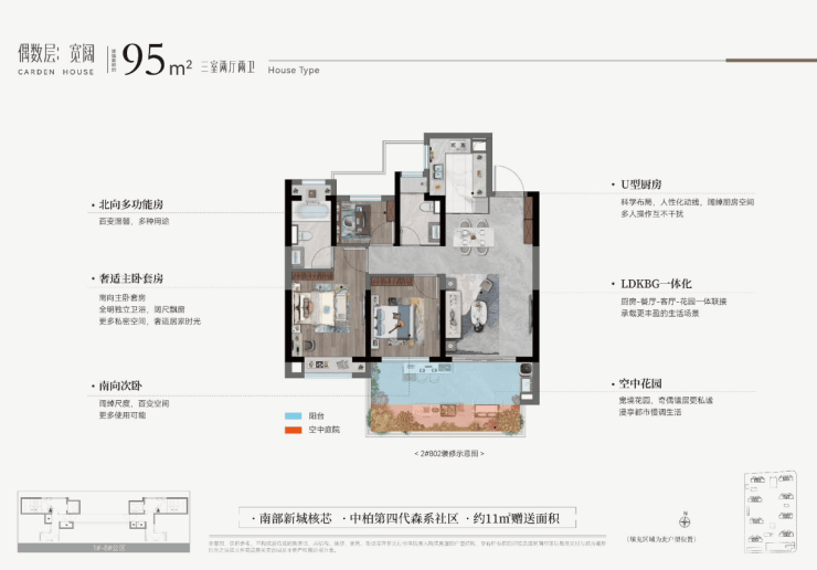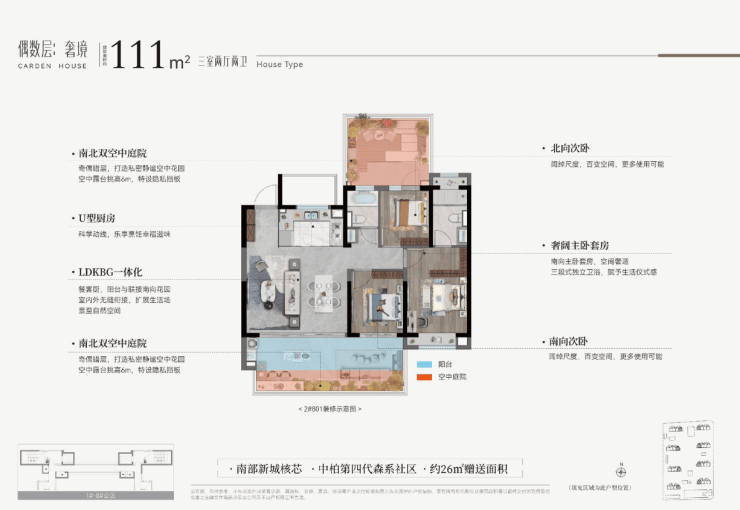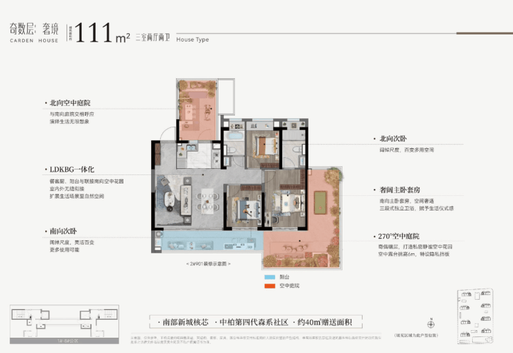 设计亮点:第四代森系社区,奇偶层错位庭院布局(奇数层南向/270°转角,偶数层南北双庭院)