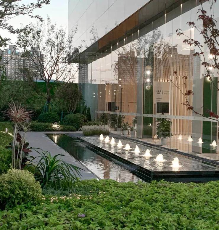 整体中庭间干净利索,用大面积的无边界水景来烘托建筑,下沉卡座作为大区一处未来格林生活场景体验打造。空间氛围现代, 清晰爽朗,不仅让客户感受项目的品质感和价值感,同时也是对未来大区生活的预体验。