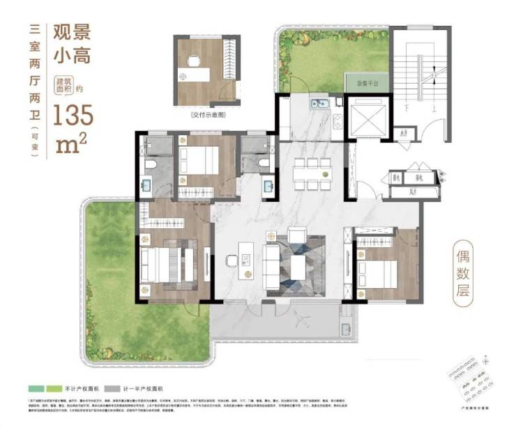 悦麓书院对“好产品”的理解,在本次主推的建面约135㎡的观景小高层户型中体现得淋漓尽致。户型采用三开间朝南的经典布局,确保主要功能空间充分接纳阳光。全明户型设计进一步优化了室内采光与通风效果。