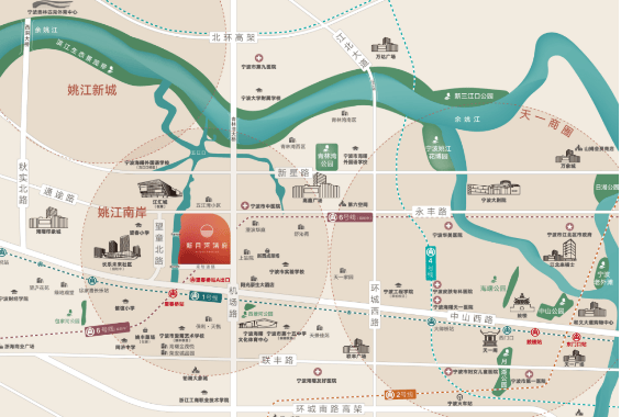 海曙一直是宁波传统政治人文核心区域。加上“宁波第三心”姚江南岸的发展,板块潜力巨大,无论是姚江南岸滨江休闲带、江汇城的开发打造五江口CBD和落定海曙首个未来社区(距离我们项目西面1.5公里),可以看出在未来3-5年之内新的板块必然崛起;当然本身项目现有配套就非常齐全