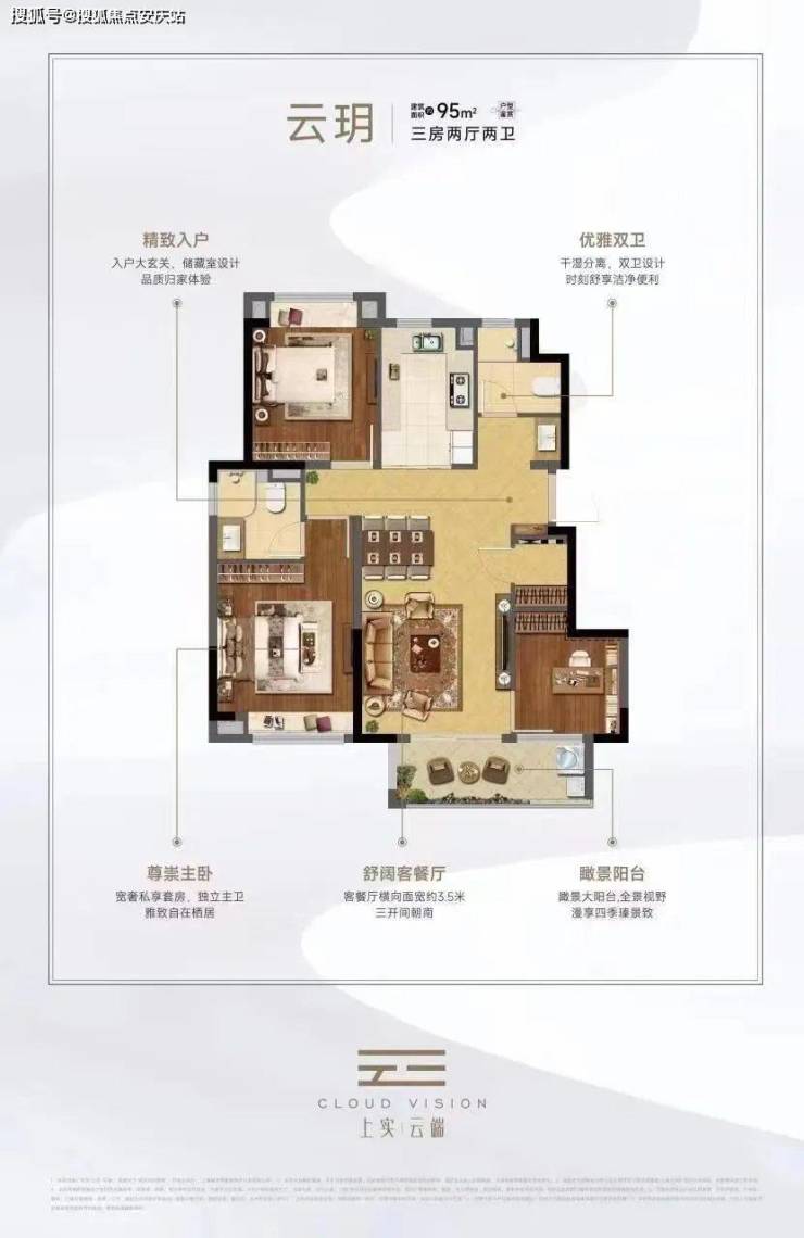 约95㎡三房两厅两卫,做到了三开间朝南+瞰景大阳台+主卧套房设计+南北通透+卫生间干湿分离,该户型得房率和空间利用率都非常高。