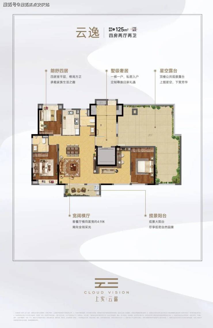 约125㎡四房两厅两卫,做到了四开间朝南+主卧套房设计+卫生间干湿分离,该户型一梯一户设计,拥有专属入户空间。