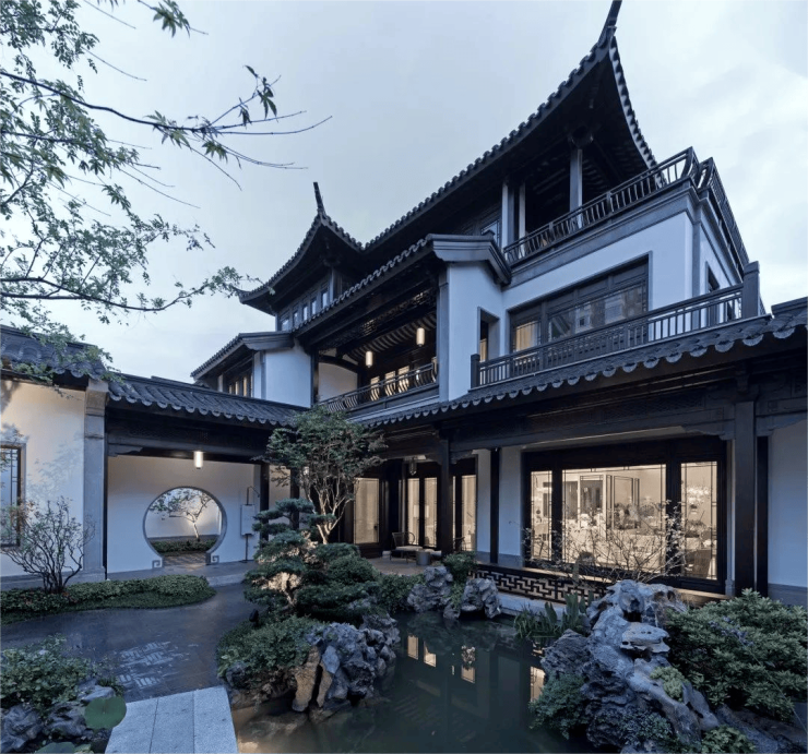 建筑风格:采用新宋风建筑美学,以白墙黛瓦、飞檐戗角演绎江南传统建筑的现代诠释,外立面采用青砖黛瓦为主要材质,整体风格沉稳大气。