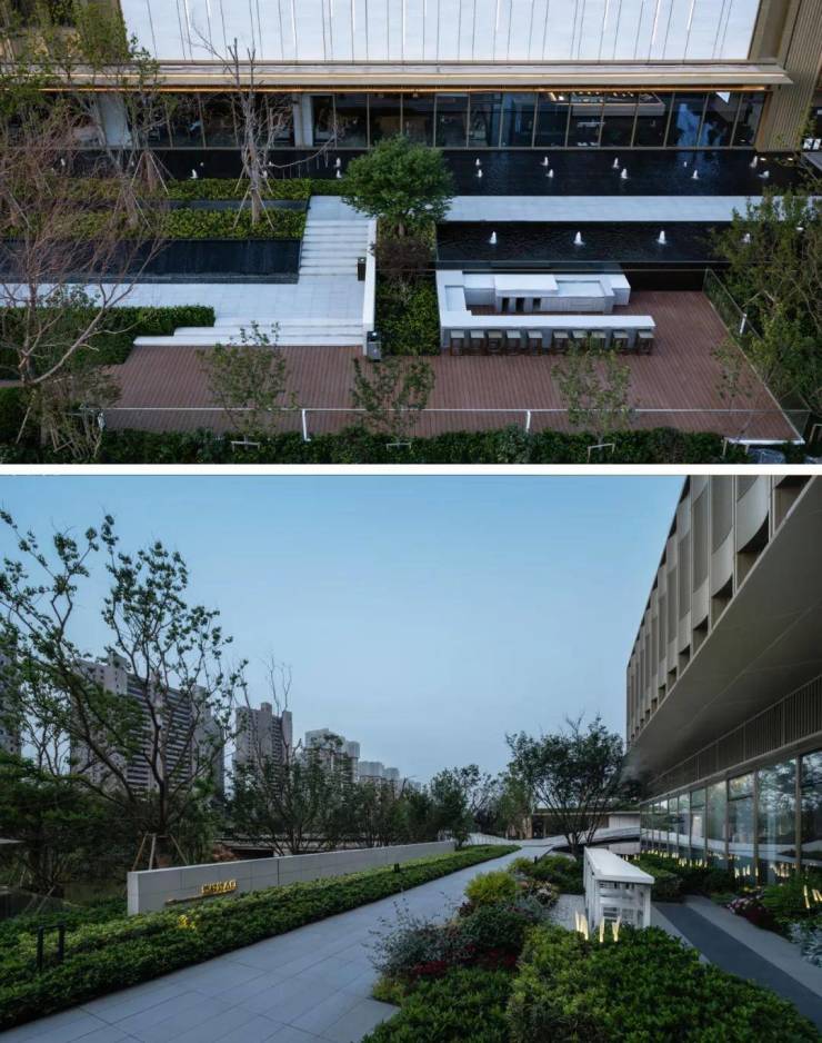 后场空间考量沿河风光带,以交错重叠的线性空间铺就行走之径,围合停驻空间。层层叠叠的条形绿篱、纵深悠长的镜面水景、自在舒适的户外吧台、纵向延伸的纯白景墙,为局限的场地提供多样化的景观语言,丰富观赏界面。