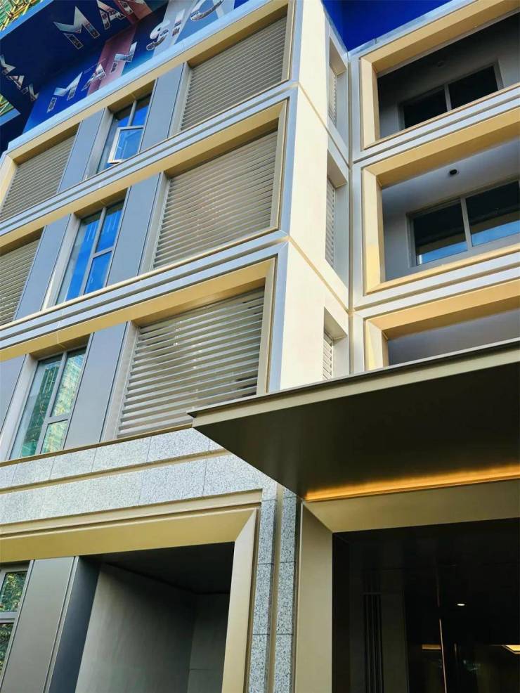 回到地面架空层,楼层单元的门厅大量采用金色铝板做装饰,与楼上的金色画框相映衬: