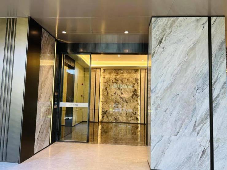 门厅入口处侧墙采用大型岩板与彩色不锈钢做装饰: