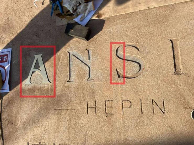 当我拿出之前特意拍的案名铜字“字槽”照片,想看看滨江又该如何处理好处在两块地砖之间的字体边缘时: