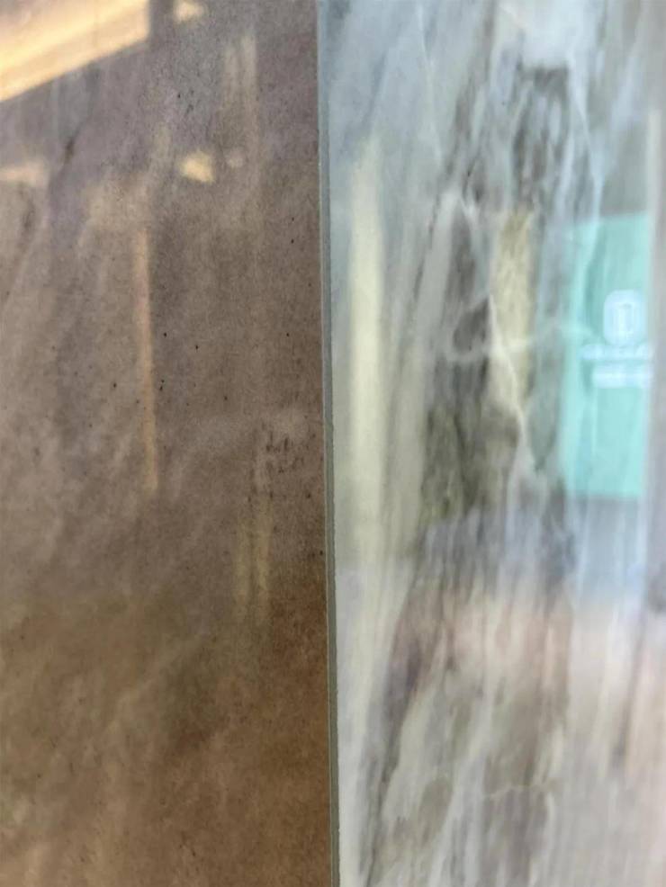 墙面大岩板的阳角对缝,直接以原板磨边方式进行45度对接,缝型均匀一致,手艺高超,效果美观,粗看还以为整个立柱都用是整块石材雕刻直接雕出来的: