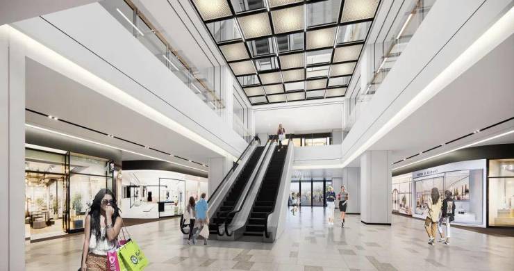 购物中心首层的设计回溯到古典时代城市中央大道,车马花灯驶过周日清晨的街道,街坊老少隔着街道闲聊;二层的过道是邻里相望的露台,家长带着孩子在露台上看巡演,仿佛从不远的未来回看当下的美好场景;三层的走道是时空穿梭之廊,金属质感和明快色彩创造出超越现实的氛围,仿佛置身未来世界。富有亲和力的公区使人倍感舒适,高品位有调性的商铺让人漫步流连,在这里,每个人都自在随心。