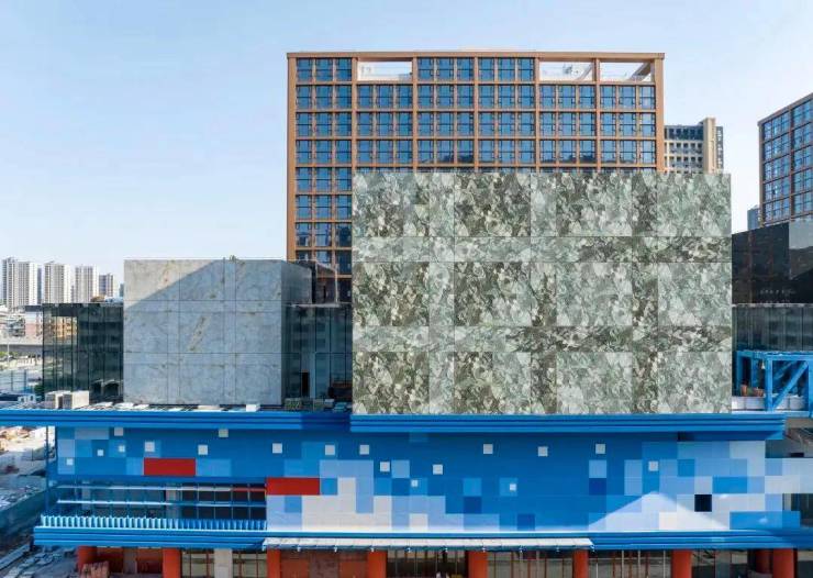 自北向南,两向入口分别以水,火为元素,以靛蓝,朱红为色调,与蓝色婺江般的南立面和红色城帷般的北立面交相呼应,共同谱写这座城市新地标的华美乐章。五行属五色,五色交织,泼墨出一幅源于金华,放眼世界的山水长卷,象征着包容,平衡的中华文化。