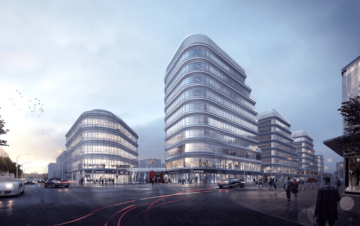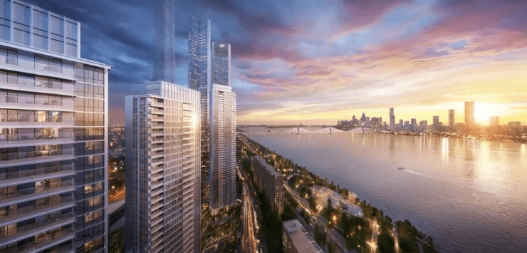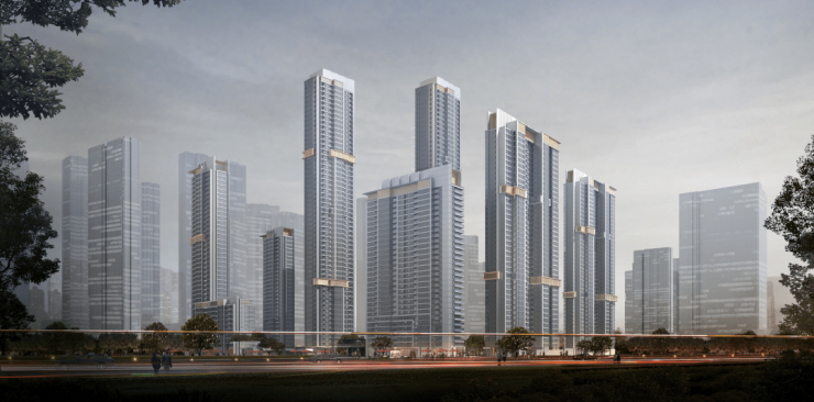 1号楼为47层、2号楼为33层、3号楼为46层、4号楼为1层、5号楼为4层商业楼; 1号楼为3梯4户、2号楼为2梯4户,3号楼为3梯4户