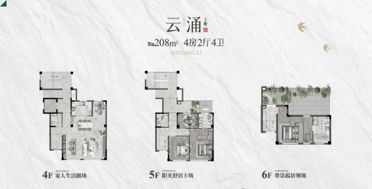 ·建筑面积约为208.45㎡4房2厅4卫的户型,上叠分为三层,地上四层、地上五层、地上六层(附带不上人屋面的大露台)。