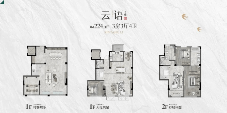 户型面积:平层185㎡,上叠208㎡,下叠224㎡