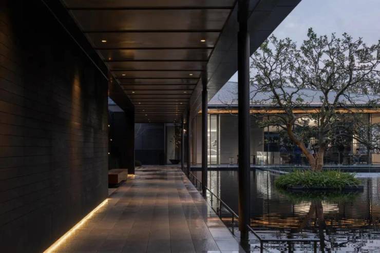下沉庭院与空间全方位渗透,强调东方美学的人文气质。流水景墙垂直度高达6米,以钢结构骨架干挂,墙体石材采用中国黑花岗石横向拉槽处理,形成匀速下落水幕。毛石元素的融入展示人文印刻的痕迹。
