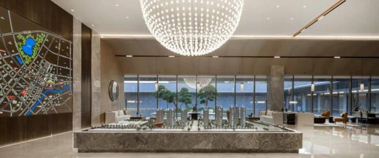 行至大堂,通透的落地超白玻璃与室外取得似离而合的分隔,建筑与环境得到有机融合。