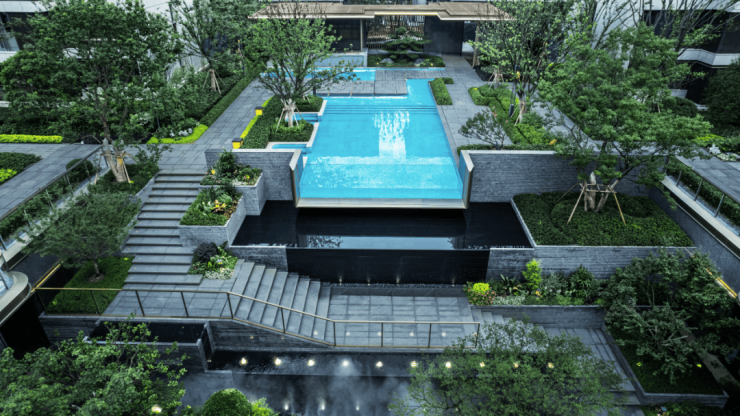 驻足于下沉庭院,只见澄澈的飞瀑,层层叠水流淌出宁静而和谐的韵律。水面折射天空流云,微风荡起涟漪,于高处俯瞰,感受被景色包围的安宁,让身心来一场森境“度假”。