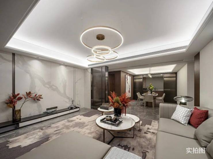 进门就是视觉盛宴,大中厅奢华雅致,客厅以精甄细选的大理石进行铺装,有着灰色调的高级质感。背景墙用了大面积的岩板,在金属线条的衬托下,呈现出历久弥新的臻妙质感。