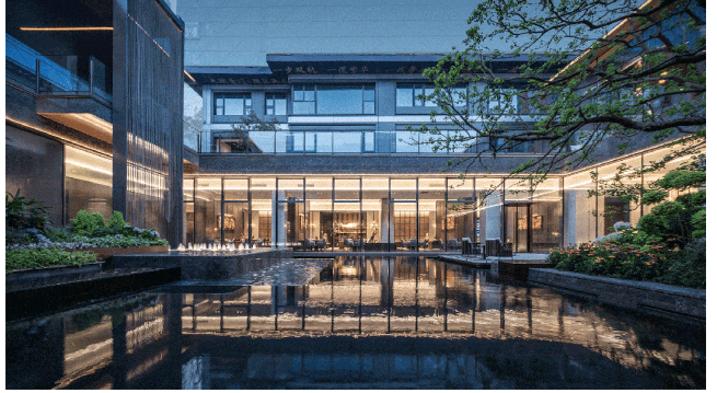 东方美学园林:以“引湖入园”为理念,打造下沉式中央庭院,融入进口蓝翡翠奢石、飞流星瀑、百年丛生乌桕等元素,营造出诗意的东方禅意画境。