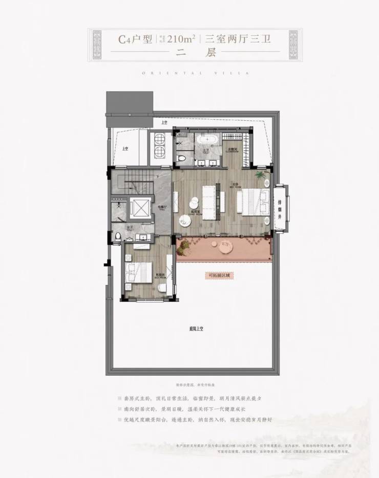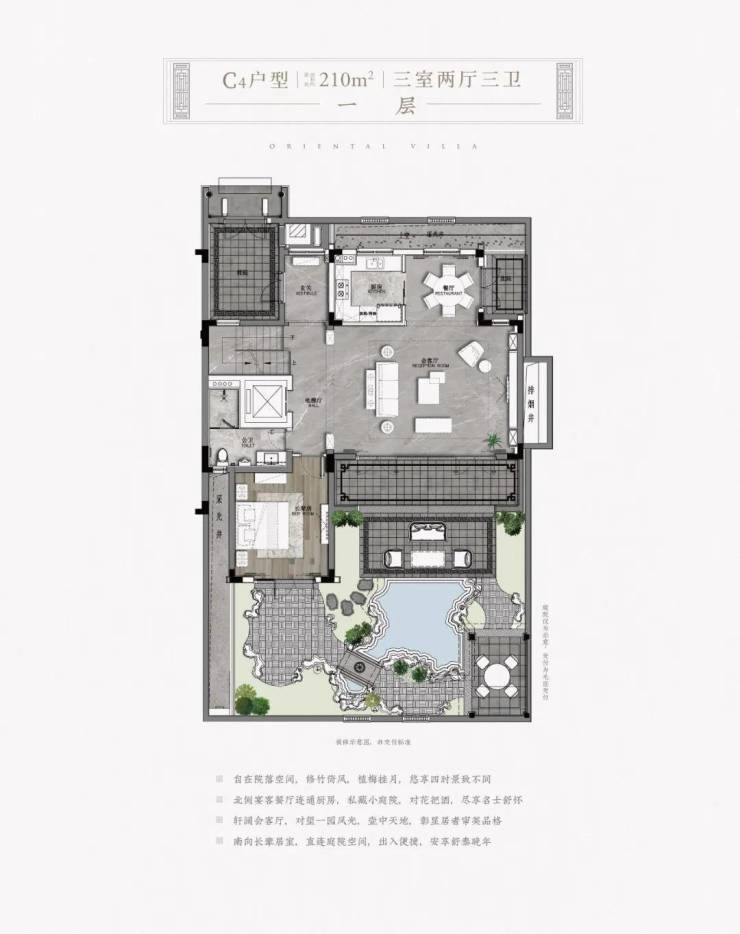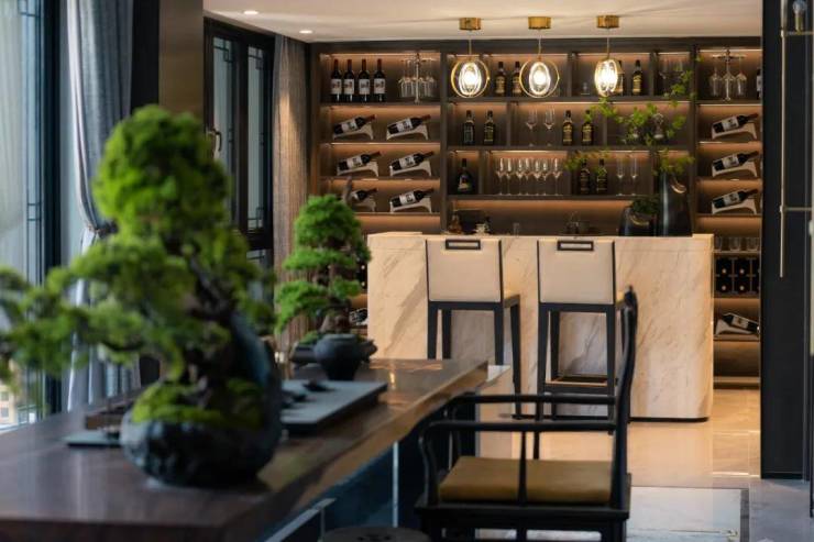 以项目东北角的建面约330㎡H户型为例,地下二层的室内可配置保姆房、家政间、影音室、酒窖、棋牌室、品茗区,室外可设置一个园池檐亭的中式庭院。