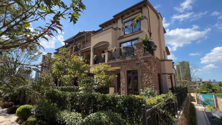 建筑设计:整体建筑风格充满美式加州格调,由美国洛杉矶奥运会主会场规划设计师之一查尔斯・匹格先生参与规划设计。排屋楼底层外立面为面砖,中层涂料,以白色为主色调,简洁大方又不失异域风情。