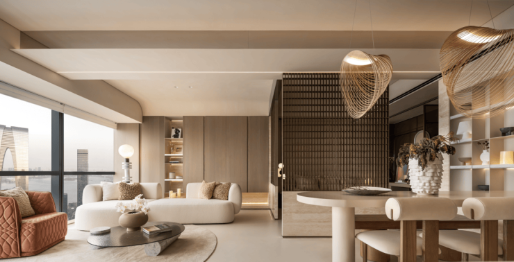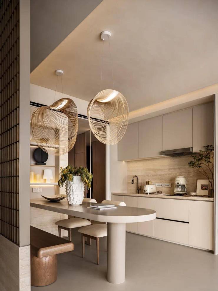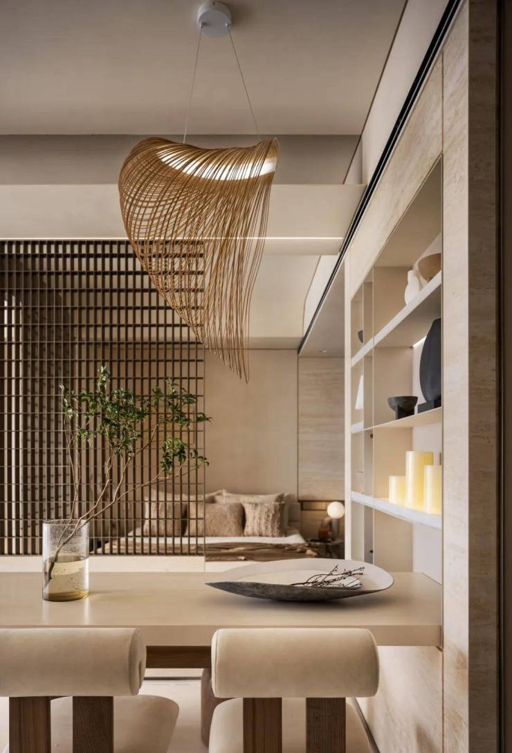 开放的客餐厅空间独揽窗外风光,利用优质的景观资源形成开阔的视野空间。空间中大量采用温润柔和的材质,以材质传达情绪,这种平易哑喑的肌理让人感到愉静沉淀、精神安然,在无形中感受被沉淀下来的生活气息。