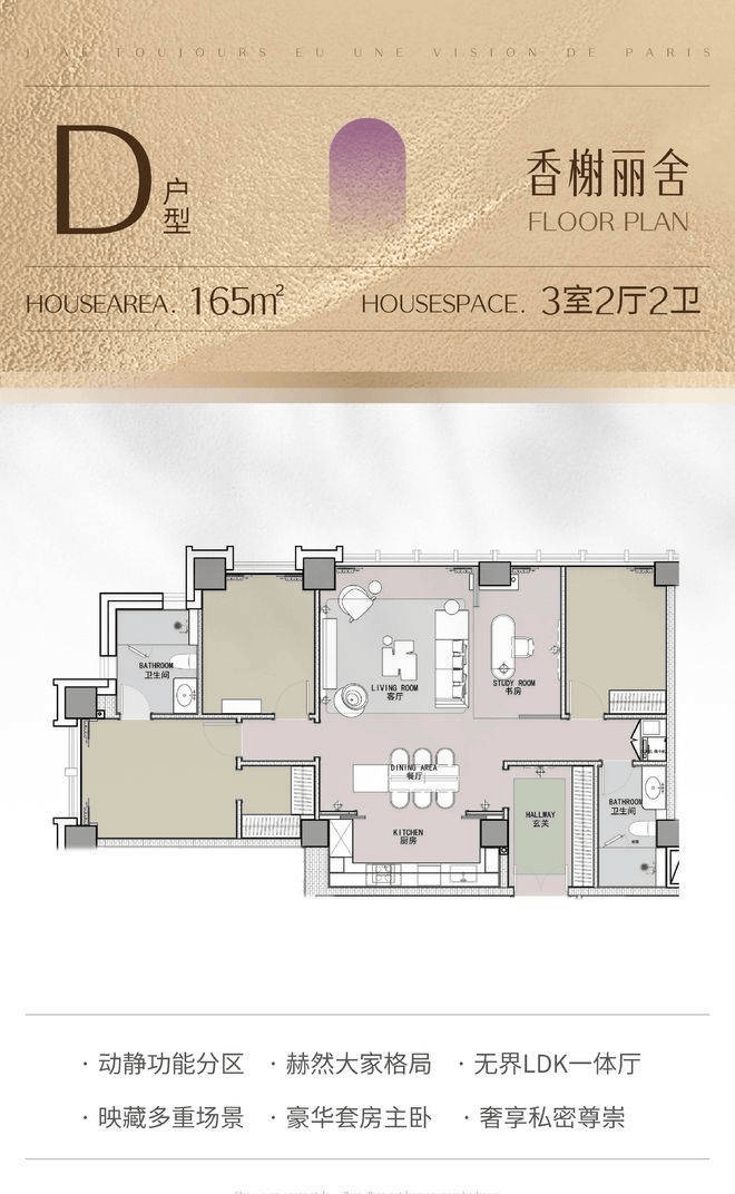 165㎡:3/3 + 1 房 2 厅 2 卫,设计灵感源自香榭丽舍和薰衣草庄园,空间更为宽敞,可灵活改造,适合改善型居住。