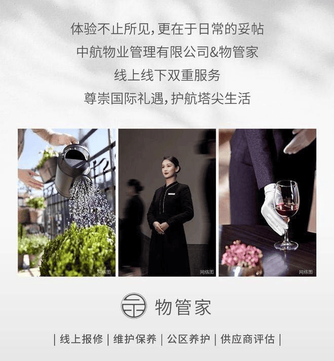 其外立面采用全新干挂石材 + 玻璃幕墙,采用法式奢装,配备中央空调、地暖、新风系统,由中航物业 & 物管家提供物业服务,