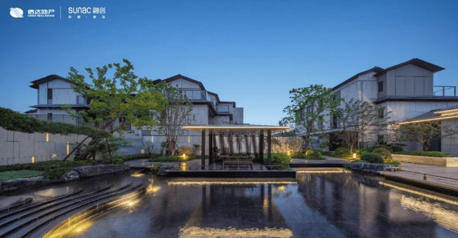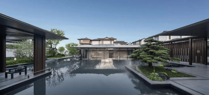景观规划:中央景庭由合院区两大水院意趣相融而成,在低密住区中打造罕见的双中心水院,与晶莹剔透的现代玻璃建筑相映成趣,临水观照,逸趣自生。三进院落归家尊仪,一进长巷渐舒,层林浸染;二进松瀑石涧,四水归堂;三进纳湖入院,碧波粼粼,层层叠进彰显当代名门大家之仪。还有 “看松读画轩,月到风来亭” 等浮水为台、观水为亭、依山为榭的亭台水榭胜景,以碧波浸亭,陶公钓矶、颐乐茶室等写意当代东方的人文清雅 。