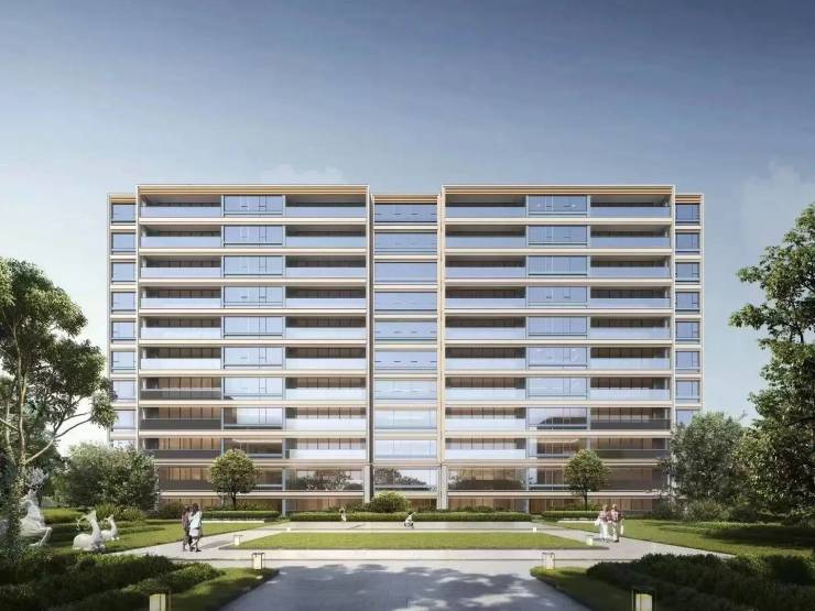 建筑:绿城 SUPER FLAT 立面,石材与玻璃幕墙结合;楼间距 31-43m,层高 2.97m,部分楼栋有架空层泛会所。