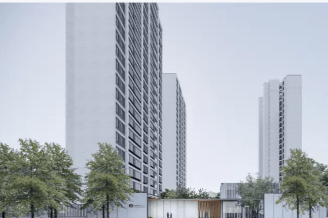 建筑设计:由 3 栋半围合式高层组成,外立面以真石漆进行点缀,同时采用大量玻璃幕墙,扩大楼间距,既呈现了建筑的品质感与美观性,又保证了良好的采光。