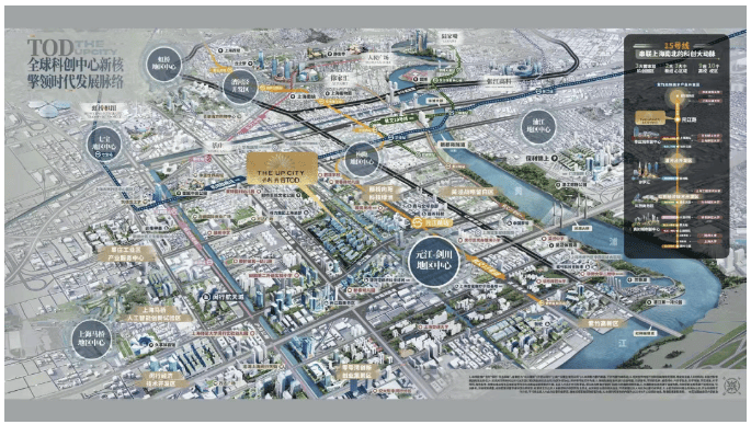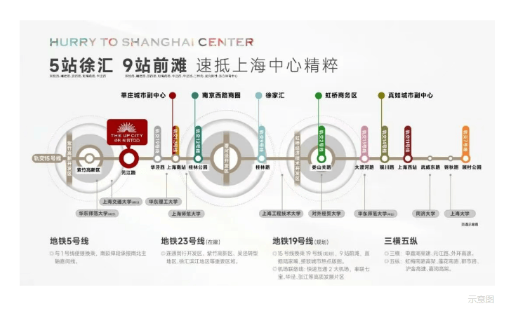 轨道交通:处于地铁 15 号线元江路站上盖,紧邻地铁 5 号线颛桥站,通过地铁可快速到达徐汇、长宁等中心城区。