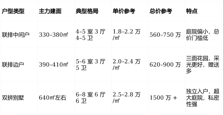 典型户型举例:378㎡联排边户(4 室 6 厅 5 卫)、386㎡联排(5 室 5 厅 5 卫)、640㎡双拼(6 室 9 厅 6 卫);普遍为南北通透,一层长辈房朝南,二层双卧 + 书房,三层主卧套房 + 露台,地下室可做多功能区