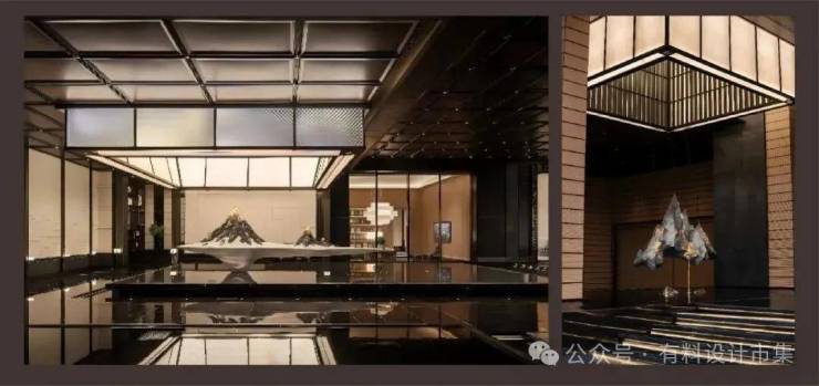 转入二进,香槟金方格吊顶与悬浮云石遥相呼应,刚柔并济,宛若诗句对仗。天光水色与金属微光交织,室内外的景、声、光在此交融,构成前庭-架空-内院-序厅的空间韵律,每一步皆行走于艺术与生活之间。