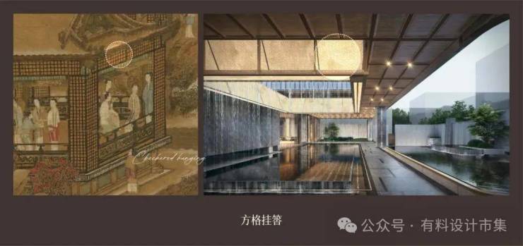 方格挂䈋饰以烫金不锈钢,与垂落的水帘相辅相成。光影交错间,空间顿生层次与韵律;水影朦胧,为沉静的氛围注入一丝灵动与诗意。