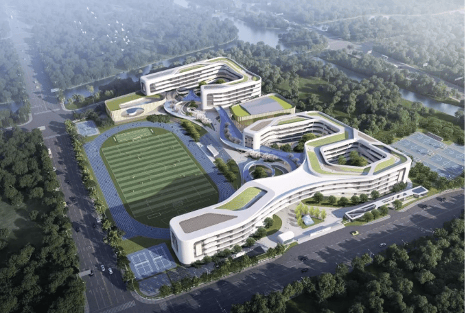 建筑采用经典“三段式”设计,首层基座配石材,中段以宽幕配简约线条,顶部以中式飞檐形式呈现。