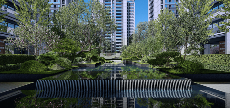 三花·江风雅颂府的园林空间,是以江南名园「拙政园」为蓝本规划,汲取东方美学的经典三进格局。以现代造园手法,由北向南将酒店式大堂、迎宾水景、仪式中庭串联起一条礼序中轴,东西双园沿中轴对称布局,秩序井然。
