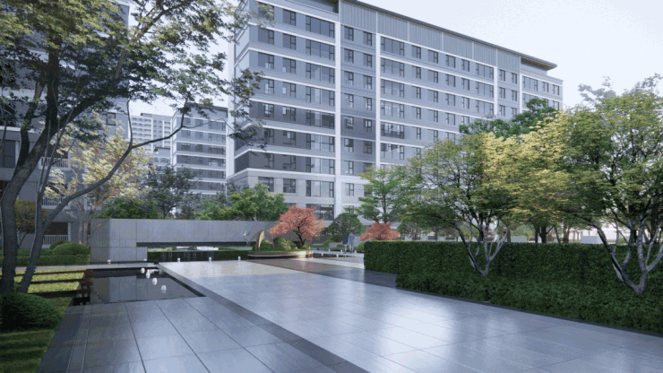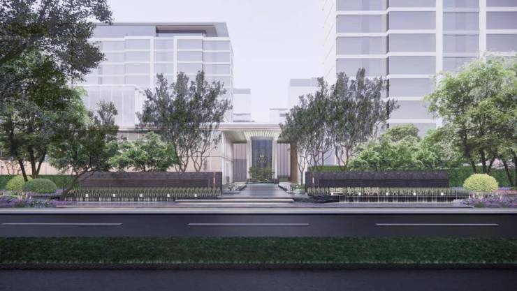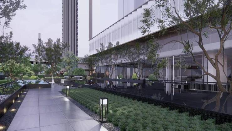 地块南侧前期为展示区,后期作为无界公园。一片镜水,水中的倒影、光线穿过树丛投射下来的光影,仿佛一幅高品质的生活画卷;穿行其中,辗转叠合,是移动的风景,亦是艺术在无界里肆意渗透;自然、多维感知、万物无界共生的场景,创造人、自然与建筑的无界共生。