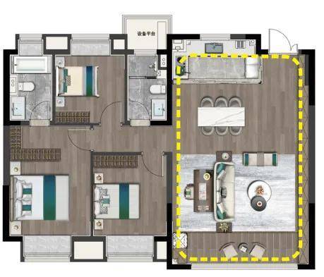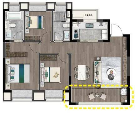 室内功能区的空间与阳台连接,空中花园、户外瑜伽、高尔夫推杆、阳光阅读台,都可在这里实现,无限释放先生和太太的闲情逸致。