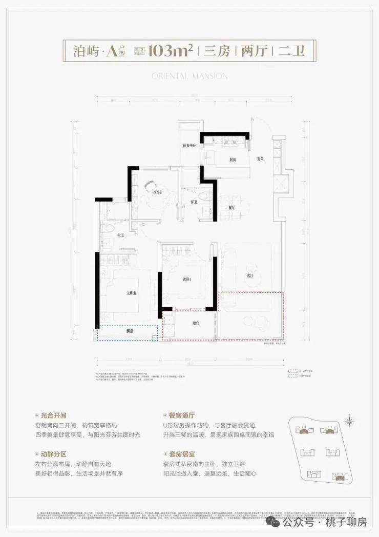 南向三开间朝南,约9.8米大面宽,约7米阔绰阳台,餐客厅贯通,并连接阳台,百变待客空间;套房式主卧,南联阔景飘窗,栖居更温馨舒适。