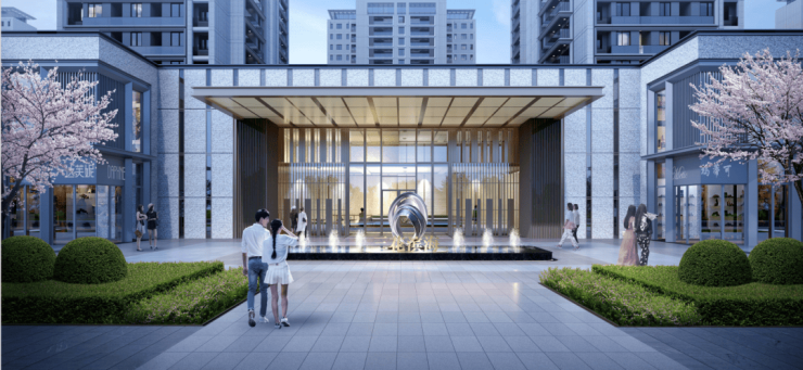 三花·江风雅颂府的园林空间,是以江南名园「拙政园」为蓝本规划,汲取东方美学的经典三进格局。以现代造园手法,由北向南将酒店式大堂、迎宾水景、仪式中庭串联起一条礼序中轴,东西双园沿中轴对称布局,秩序井然。