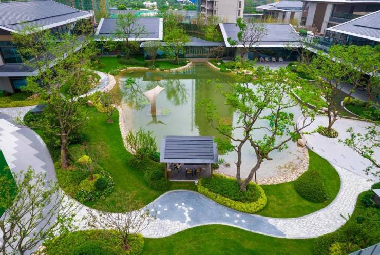 社区内规划约6300㎡中心大花园、约1400㎡中央湖区。以“碧泽玖章、游观府邸”为主题,规划双十字景观中轴、五感疗愈、游园玖景,打造度假游居的生活体验。