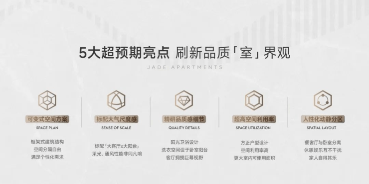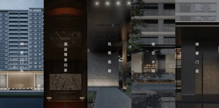 【五境归家,仪式感生活新体验】以“阔景门头-酒店尊享归家-风雨连廊-核芯水院-精奢门庭”五大场景,联动“归家-停泊-过廊-观园-入户”五进式归家礼序,各个空间相对独立且互不干扰,清晰流畅的动线,起承转合,层层递进,打造无以复加的尊崇归家体验。