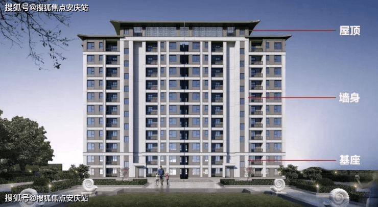 在新中式风格与现代住宅的视觉关联性上,本案做到了简洁的设计语言和精准的三段式的比例收分。在竖向上:基座——简练沉稳;墙身——竖向延伸;屋顶——飘逸舒展。