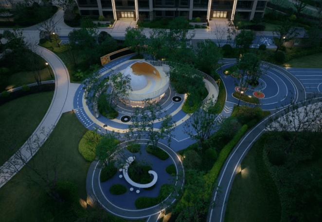 景观设计:借鉴书院的建筑与景观关系,打造一轴一环七境的园林景观,呈现礼序与自然并重的和谐关系。匠造书院雅集、砚池雅座、鲲鹏乐园、数学花园、棋语艺苑、乐活天地六大室外全龄互动空间,还有约 600m 环形健康跑道,将园林各区串联。