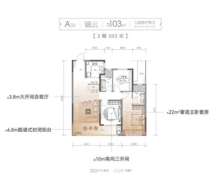 南向三开间,约10.1米奢适尺度,进阶空间享受;近7米包阳台设计,超级瀑布屏无边景观视野;约7米进深轻奢型主卧套房,带来改善级舒居体验;作为绿城·锦玉园品质改善的入门级产品,建面约103㎡品质爆款,以领先市场同类产品的高度,助力业主家人轻松实现居住改善的需求!