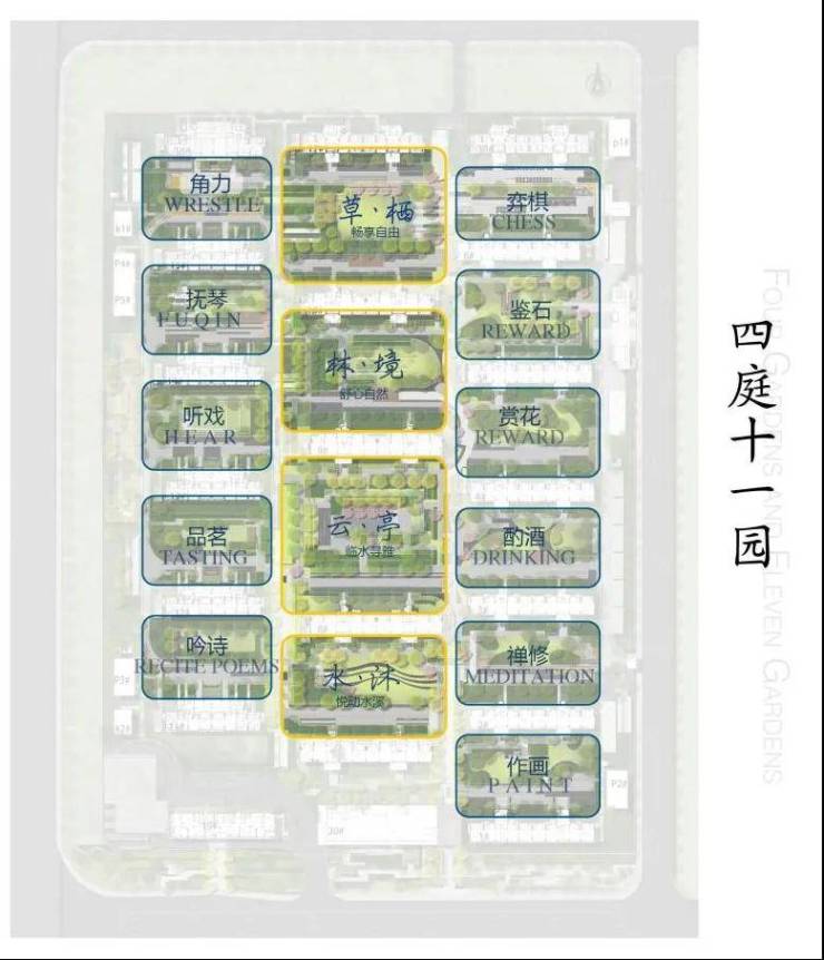 十一园——打破传统与国际的古今边界,取《姑苏繁华图》十一景,将十一园还原至宅间花园,营造江南生活层层递进的自然场域,在园林景观设计中植入琴棋等传统文化特色,将景观的仪式感与人的参与感相互融合,实现睦邻无界、成长无界、人与自然无界的国际化公园社群生活。
