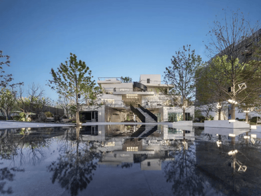 建筑美学:建筑设计强调简洁与结构清晰性,立面以横向与纵向线条构成,大面积开窗引入自然光线,与周围景观呼应,整体风格现代沉稳,体现克制的精致感。