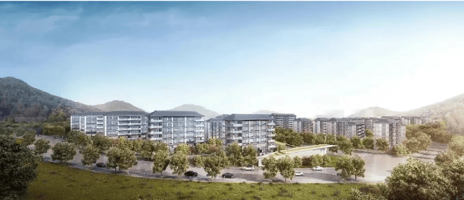 另一方面项目是真正的半山位置,外享2700米的自然山林,内部结合山地地形,形成这种竖向的3D景观。在相同面积下,可以布置更多层次更丰富的绿植,也可以结合地形打造起伏的步道或者儿童乐园,私密性更好,趣味性更高。营造出“自然无界的沉浸式居住生活体验”。